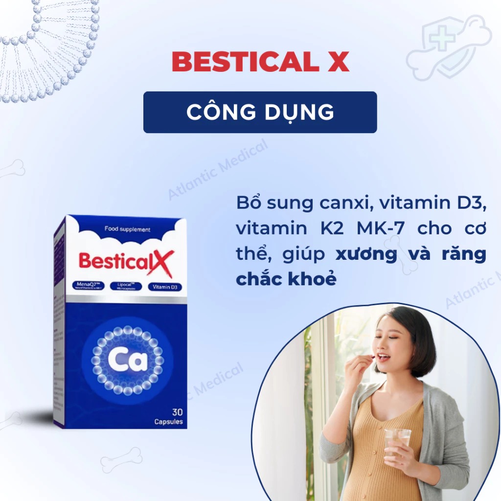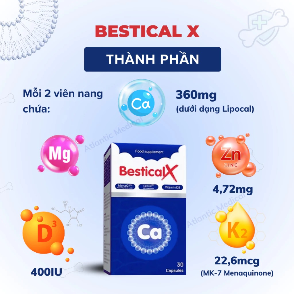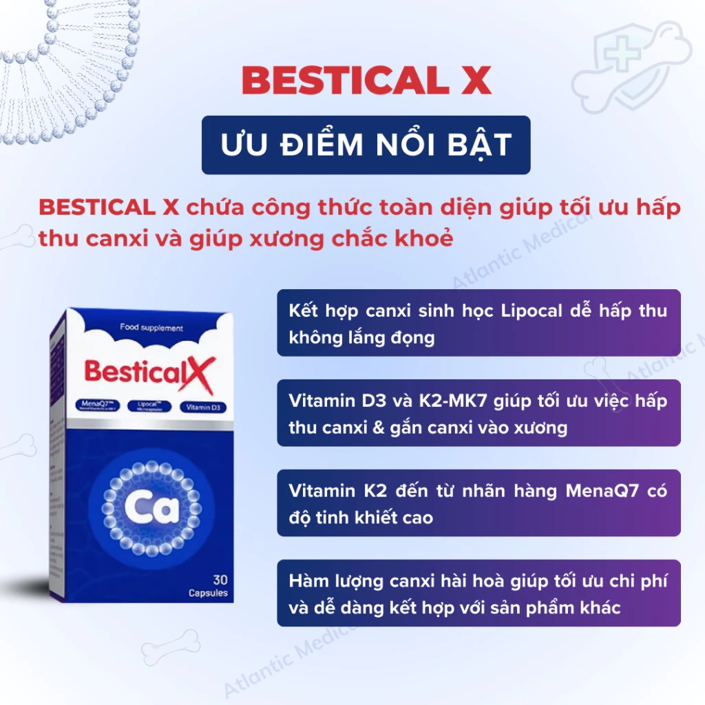 – Canxi sinh học Bestical X chứa vitamin D3, vitamin K2-MK7 giúp tối ưu khả năng hấp thu và gắn canxi vào xương