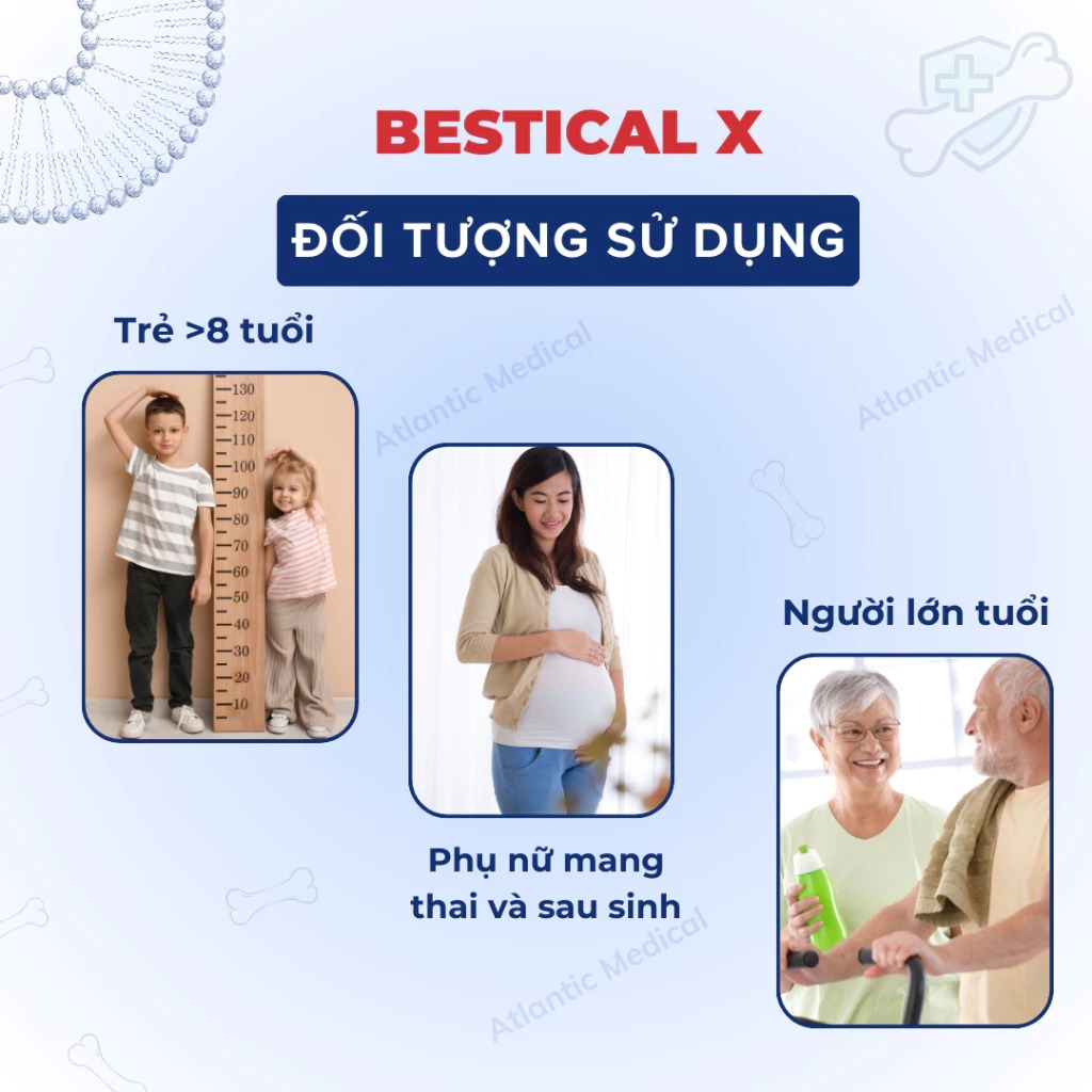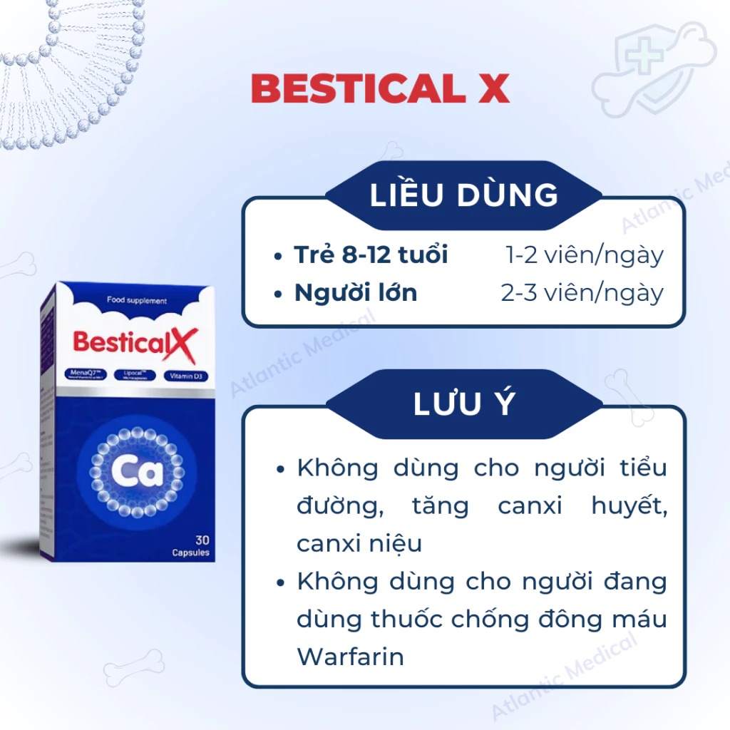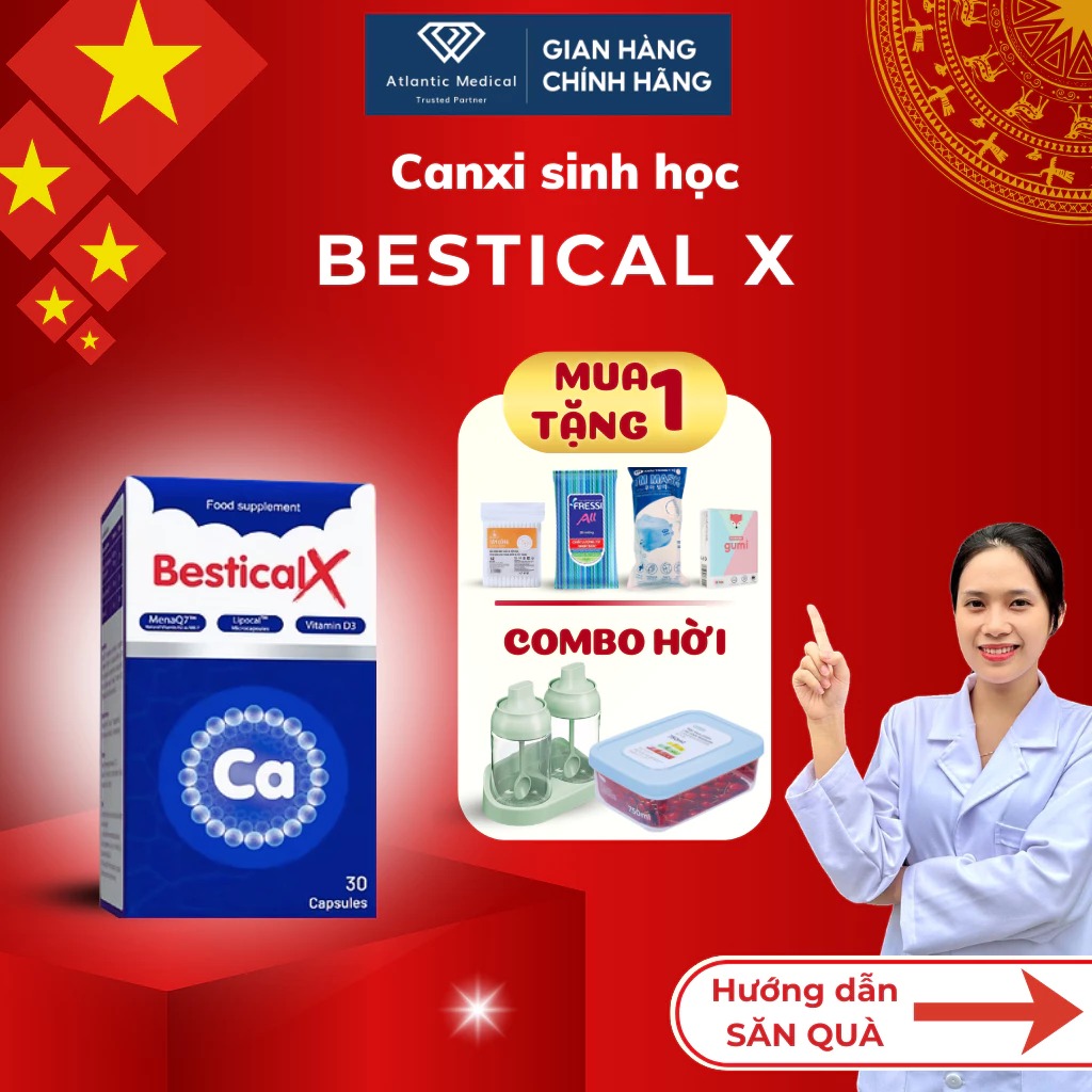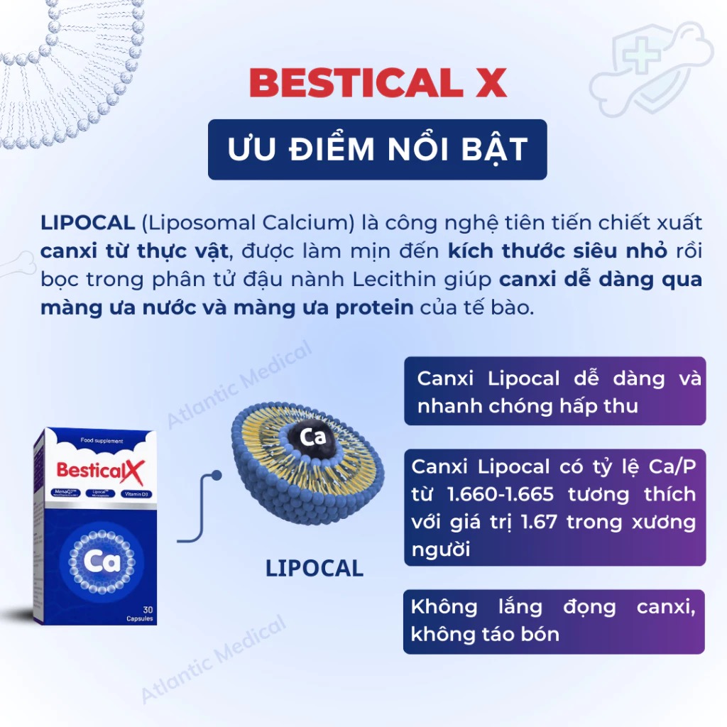 – Canxi sinh học Bestical X chứa vitamin D3, vitamin K2-MK7 giúp tối ưu khả năng hấp thu và gắn canxi vào xương